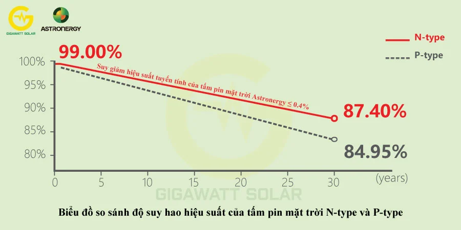 - Công suất cao và hiệu suất cao: Tấm pin mặt trời ASTRONERGY TOPCon loại N hứa hẹn hiệu suất là 23.2%